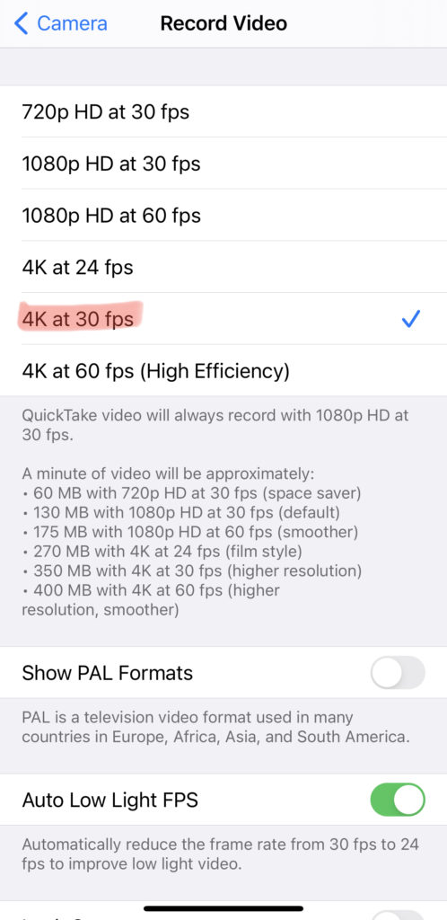 初期の私のYouTube動画ではiPhone11 Pro Maxで撮影していました。カメラのモードは1080p HD/30fpsで撮っていました。